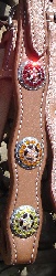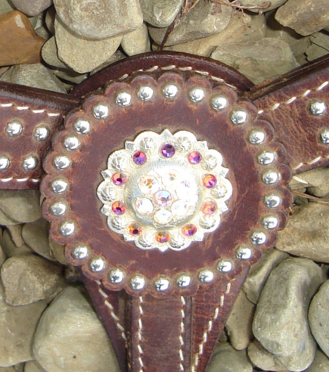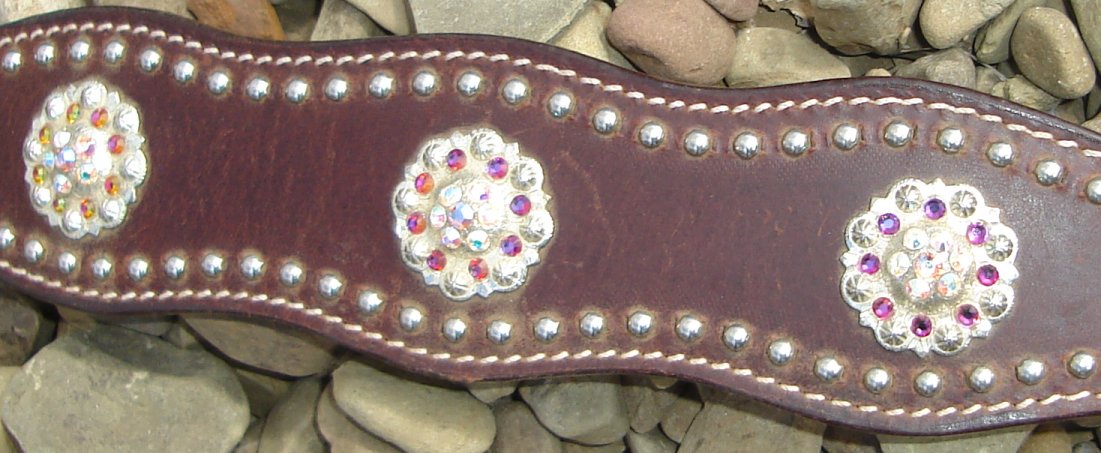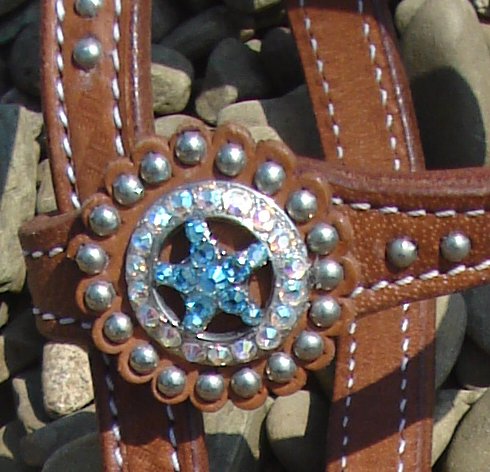 Conchos are accented with iridescent crystal and aqua Swarovski rhinestones.