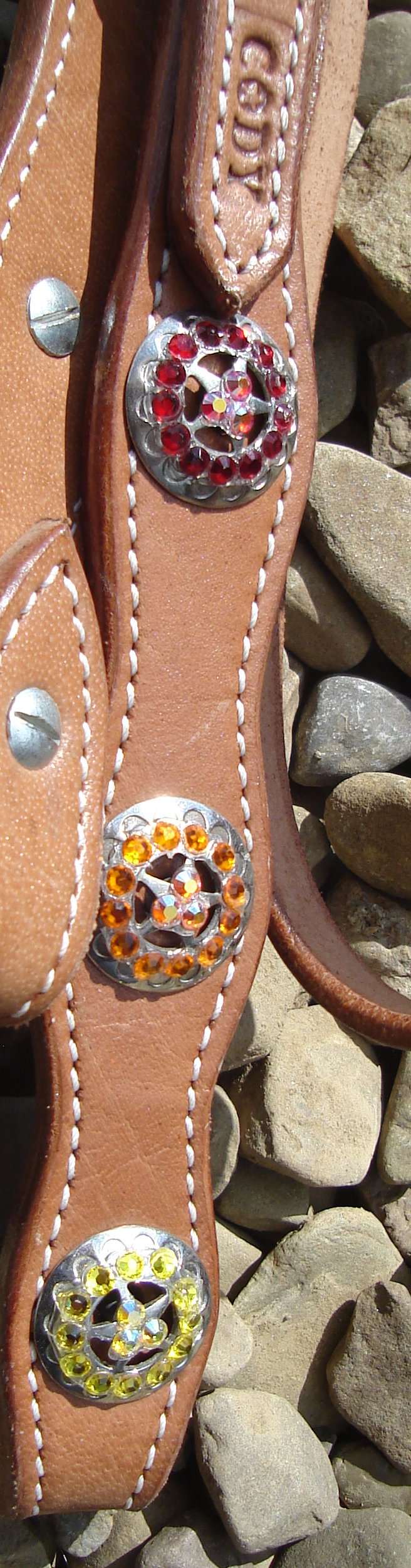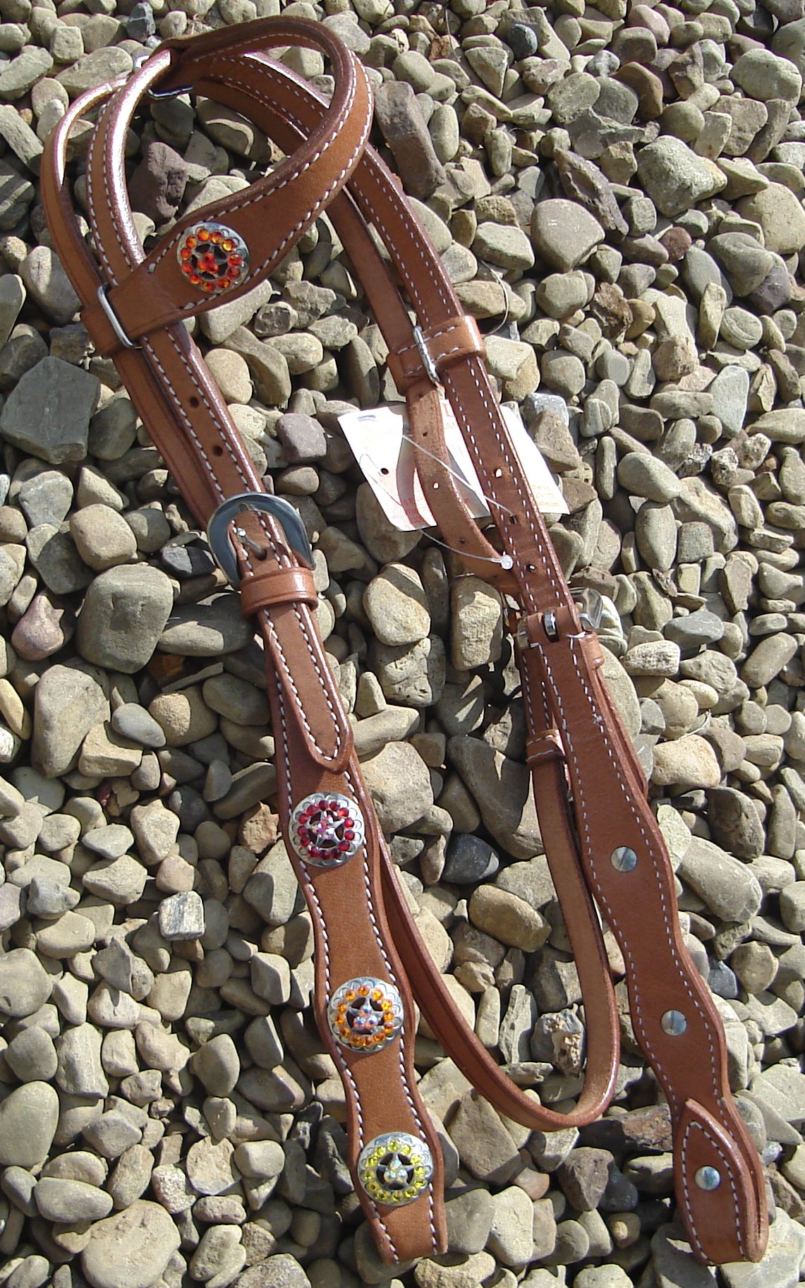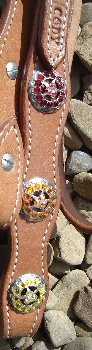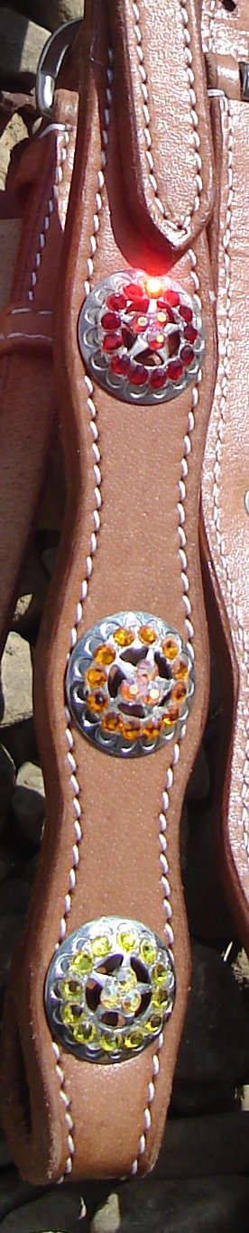 Red, orange and yellow stone accent silver star conchos down each side of headstall.